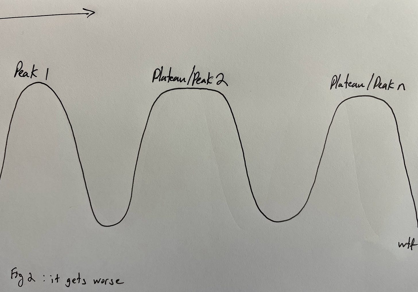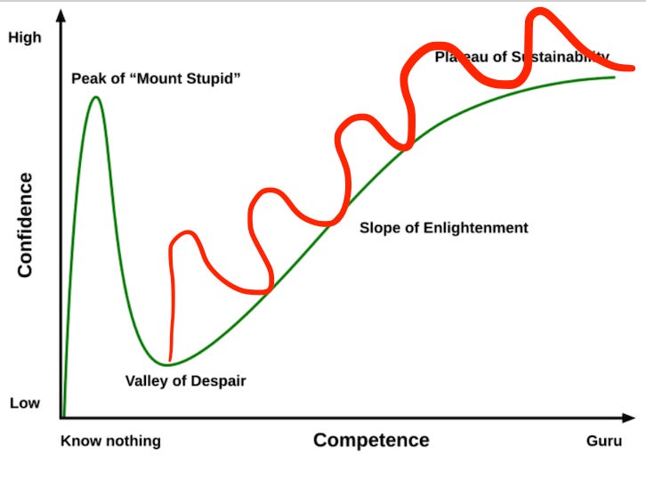 Is it more likely that you get to the Plateau of Sustainability only to realize you’ve been climbing another Mount Stupid all along? I think the diagram looks more like this: