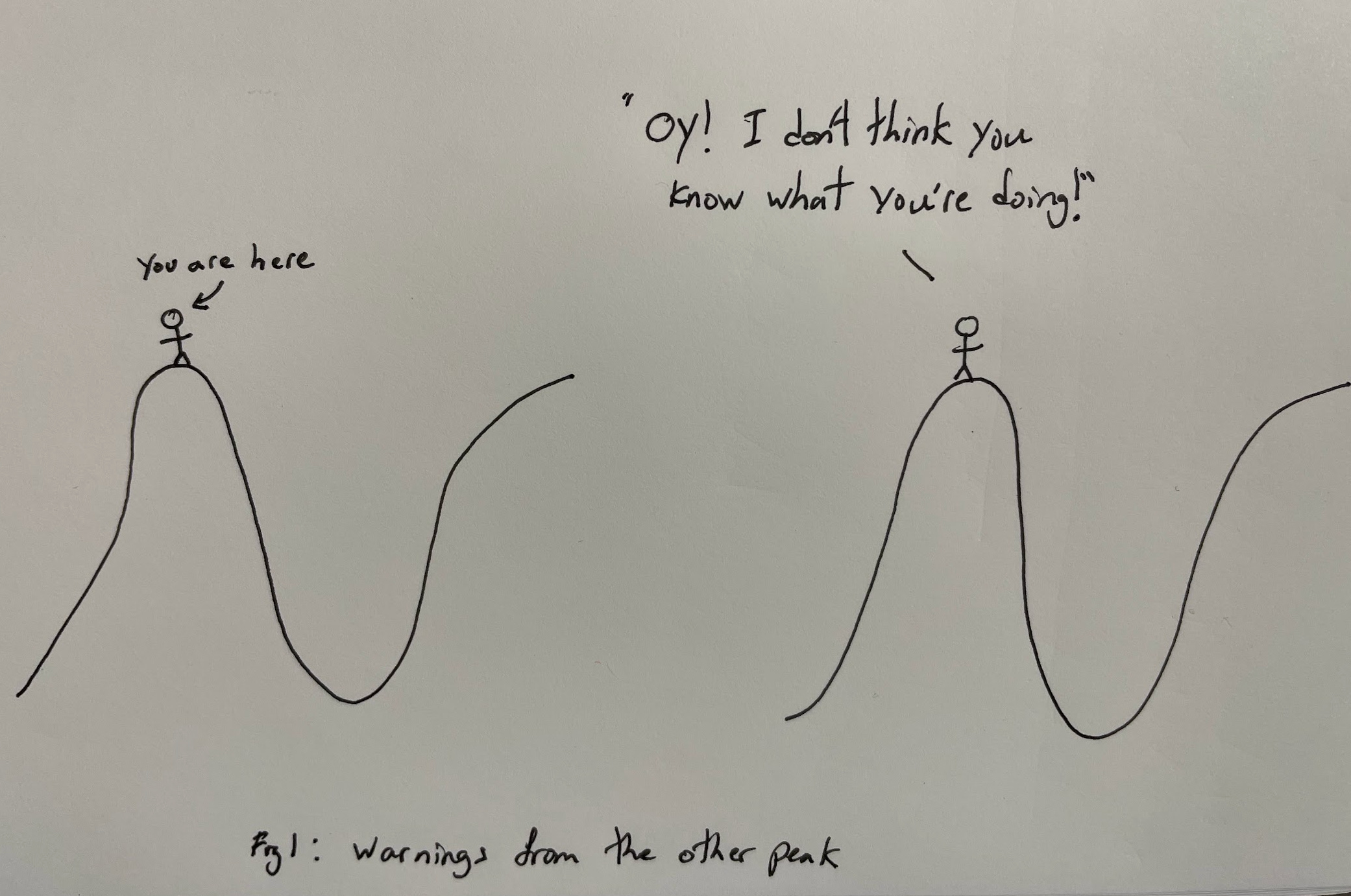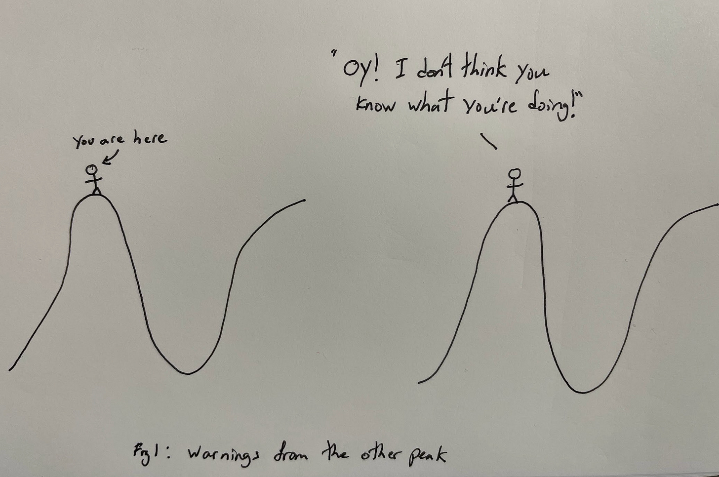 So you’re climbing Mount Stupid solo dolo and the worst part is that you’re the only one who can’t see that you’ve got your head up your ass. Your mate on the other mountain tries to warn you but do you listen? Your self confidence doesn’t let you. It’s only as you get high enough in your climb do you see someone else climbing their Mount Stupid and realize your own folly.