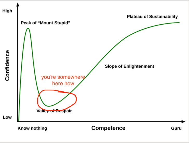 Now you’re trying to get down the mountain while holding yourself back from vomiting because of how cool/collected/correct you thought you were. The descent is steep and your knees are completely toast. Most importantly, it’s sobering. You’re humbled. Welcome to the valley of despair.